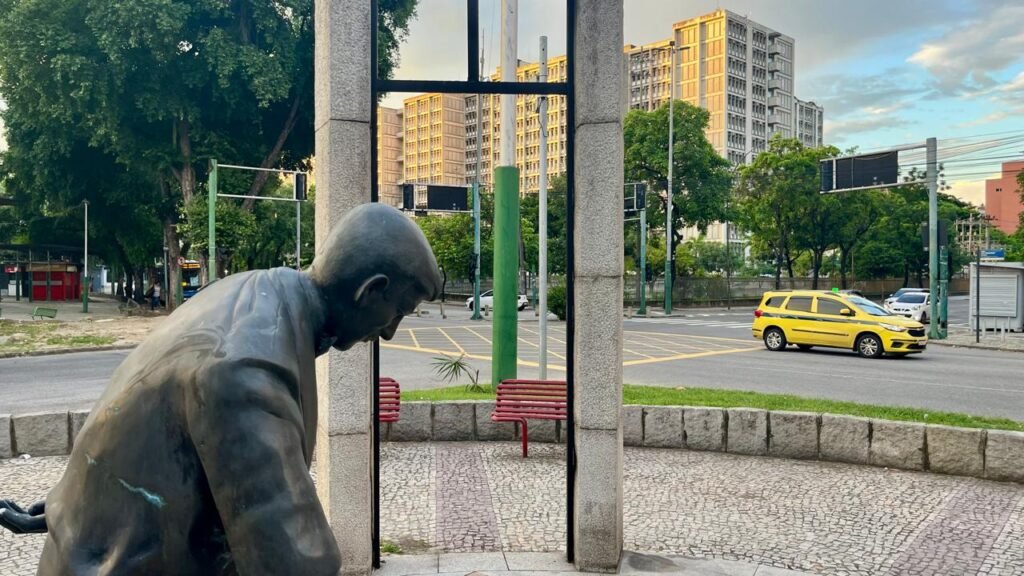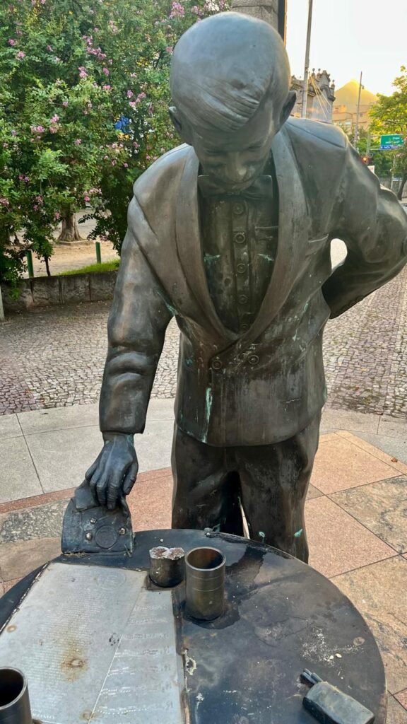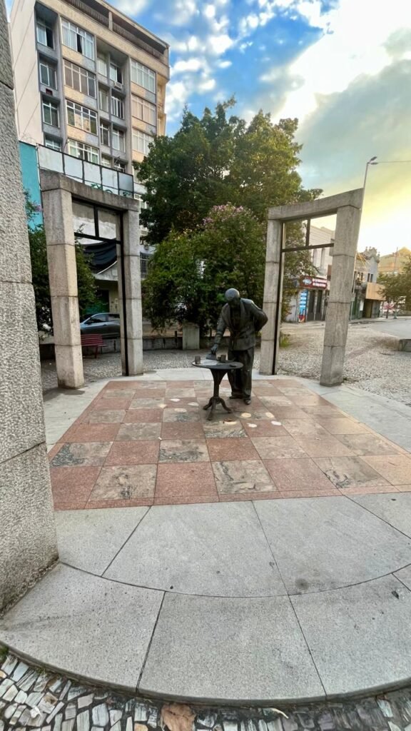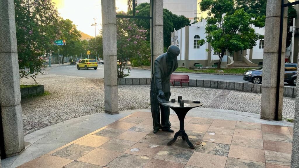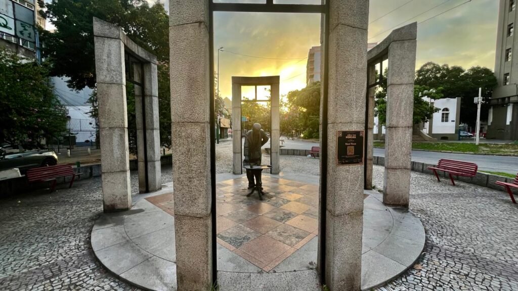 Meus amigos Rodrigo Braga e Bernardo Ferrer me alertaram que este monumento está completamente vandalizado. Eu na verdade bati a foto com o Garçom!!! O Noel com o seu rosto torto, ficava sentado em um banquinho com este garçon servindo-o. Foi ROUBADO!!! Já achei estranho que no Google Street View, que postei acima, não tinha estátua nenhuma… E, realmente, na minha foto com o garçom, não há o famoso queixo de Noel. Meus amigos me informaram… Vejam como era…. e cliquem aqui.
