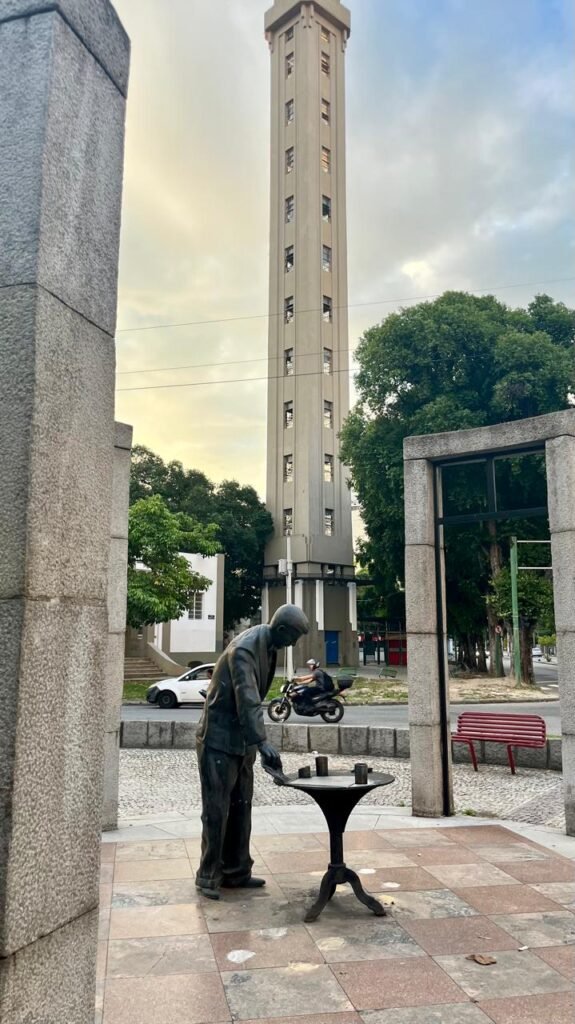 Novamente… passo por ali tem anos, e nunca olhei para ver. No início da rua 28 de Setembro, bem na quina da UERJ, temos ali esta homenagem. Uma pracinha, com banquinhos para sentar, onde vemos Noel, umas partituras sobre uma mesa e uns copos, sendo que um deles já foi vandalizado… Era a garrafa, e o garçom está limpando a mesa.